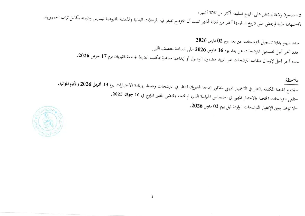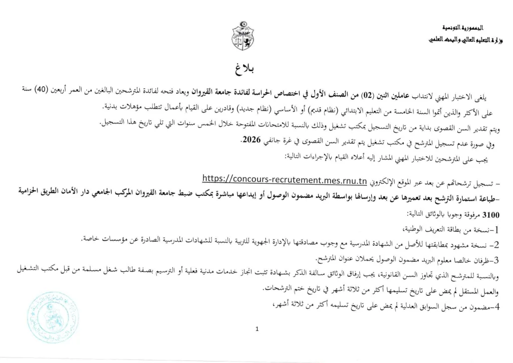 بلاغ إعادة فتح إختبار مهني لإنتداب عاملين إثنين في إختصاص الحراسة لفائدة جامعة القيروان