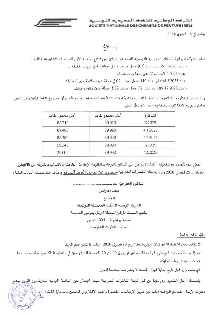 بلاغ خاص بمناظرة الشركة الوطنيّة للسّكك الحديديّة التونسيّة SNCFT لانتداب 575 عون في عديد الاختصاصات