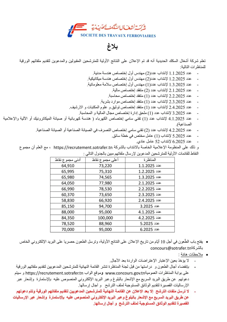تعلم شركة أشغال السكك الحديدية أنه قد تم الإعلان على النتائج الأولية للمترشحين المقبولين و المدعوين لتقديم ملفاتهم الورقية للمناظرات التالية :