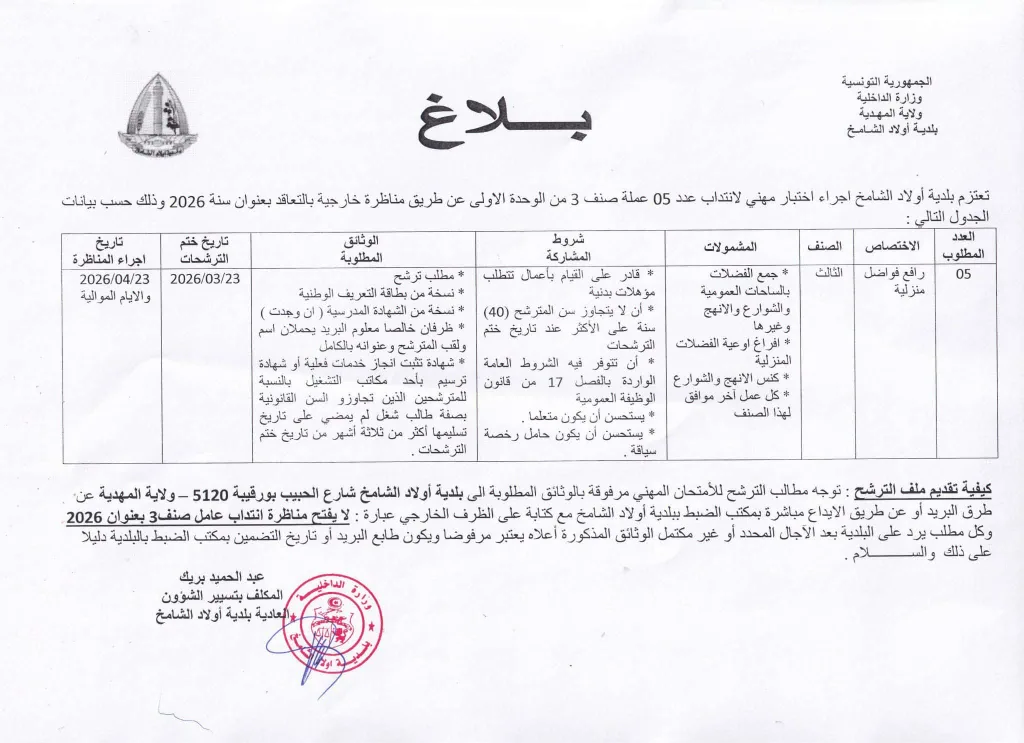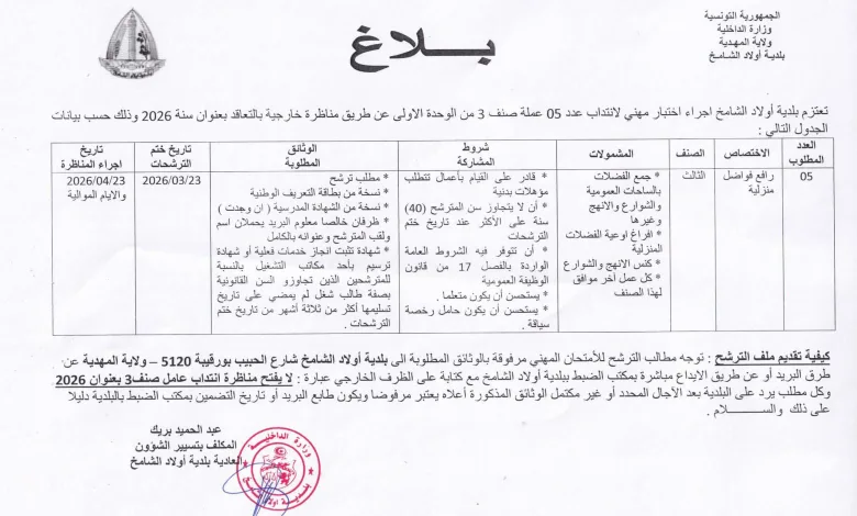 بلدية أولاد الشامخ – ولاية المهدية تنتدب عديد الاختصاصات – عروض الشغل في تونس 2026