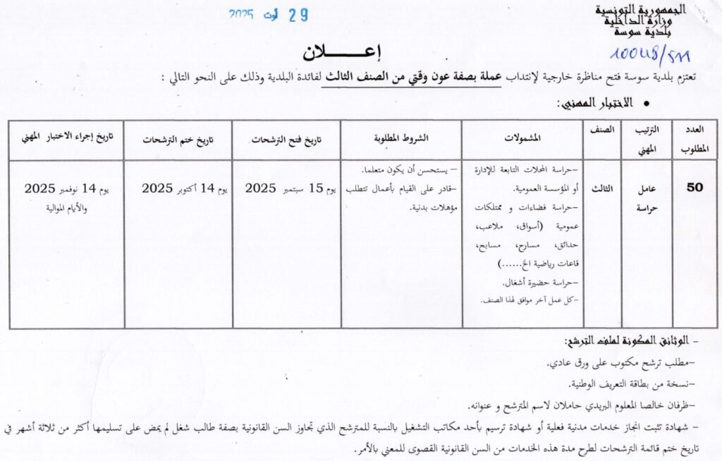 أعلنت بلدية سوسة فتح مناظرة خارجية لانتداب عملة بصفة عون وقتي من الصنف الثالث، والمتمثل في حاجتها ل50 عامل حراسة.