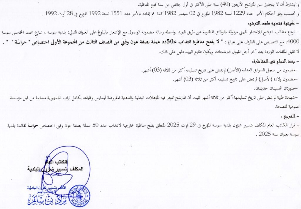 وقد ضبطت البلدية جملة من الشروط والوثائق المطلوبة للمترشحين، محددة آخر آجال للتقديم وهو 14 أكتوبر 2025.