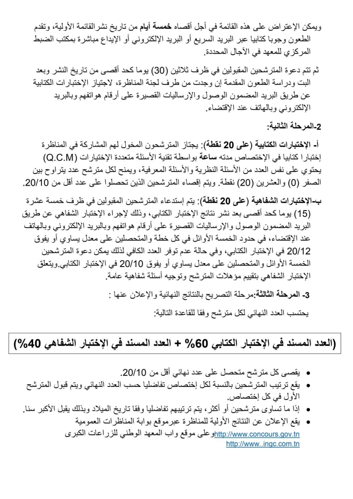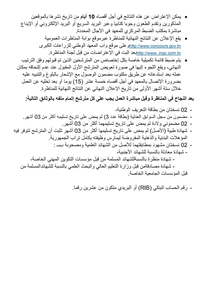 ويتم الإعلان عن النتائج عبر موقع بوابة المناظرات العمومية http://www.concours.gov.tn وبموقع واب المعهد الوطني للزراعات الكبرى http://www.ingc.com.tn