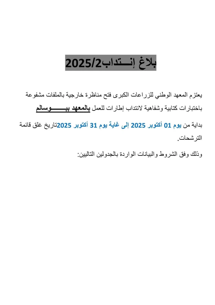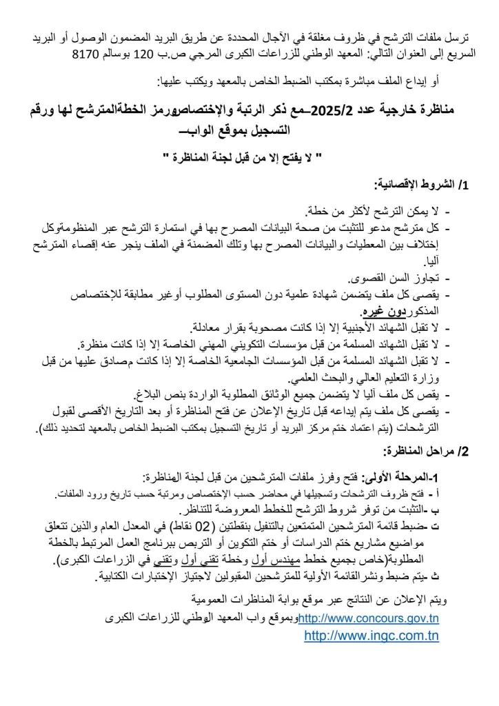 - عنوان المناظرة : مناظرة خارجية بالملفات مشفوعة باختبارات كتابية وشفاهية لانتداب إطارات بالمعهد الوطني للزراعات الكبرى.