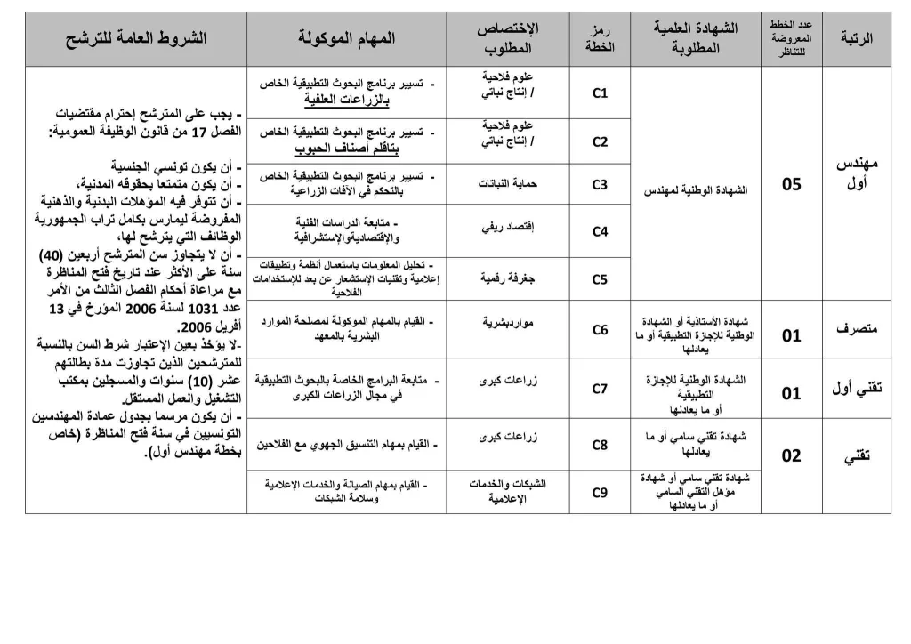 - الاختصاص المطلوب : C1 01 مهندس أول علوم فلاحية/إنتاج نباتي. C2 01 مهندس أول علوم فلاحية/إنتاج نباتي. C3 01 مهندس أول حماية النباتات. C4 01 مهندس أول إقتصاد ريفي. C5 01 مهندس أول جغرفة رقمية. C6 01 متصرف موارد بشرية. C7 01 تقني أول زراعات كبرى. C8 01 تقني زراعات كبرى. C9 01 تقني شبكات وخدمات إعلامية.