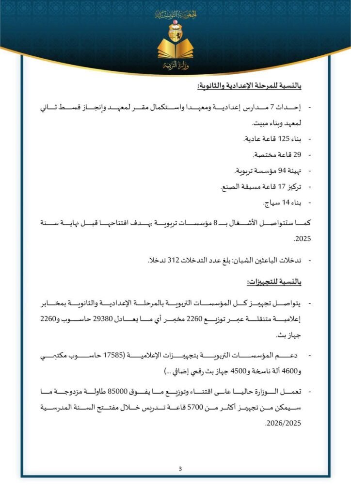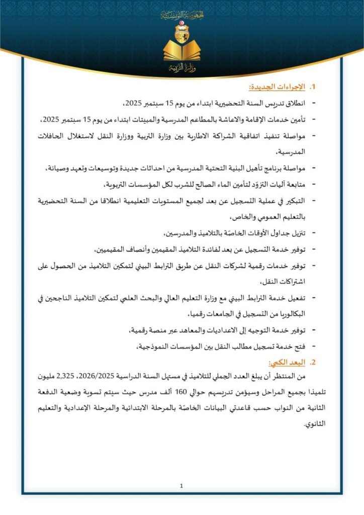 أعلنت وزارة التربية جملة من الإجراءات الجديدة المتخذة بمناسبة العودة المدرسية 2025_2026 ، وذلك في بلاغ أصدرته الوزارة على صفحتها الرسمية على “فايسبوك” مساء اليوم.